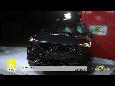 The passenger compartment of the CUPRA Formentor remained stable in the frontal offset test. Dummy readings indicated good protection of the knees and femurs of both the driver and the front seat passenger. CUPRA showed that a similar level of protection would be provided to occupants of different sizes and to those sitting in different positions. Chest protection was rated as marginal for the driver, based on dummy readings of compression. Analysis of the deceleration of the impact trolley during the test, and analysis of the deformable barrier after the test, revealed that the CUPRA Formentor would be a moderately benign impact partner in a frontal collision. In the full-width rigid barrier test, protection was good or adequate for all critical body regions of both occupants, with the exception of the rear passenger’s chest, protection of which was marginal. In the side barrier test, the CUPRA Formentor provided good protection to all critical body areas and scored maximum points. In the more severe side pole impact, protection was at least adequate for all critical body areas. Control of excursion (the extent to which a body is thrown to the other side of the vehicle when it is hit from the far side) was found to be adequate The CUPRA Formentor has a countermeasure to mitigate against occupant-to-occupant injuries in such impacts. The airbag performed well in Euro NCAP’s tests with dummy readings indicating good protection for both the driver and passenger. Tests on the front seats and head restraints demonstrated good protection against whiplash injuries in the event of a rear-end collision. A geometric analysis of the rear seats also indicated good whiplash protection. The car has an advanced eCall system which alerts the emergency services in the event of a crash, and a system to prevent secondary impacts after the car has been in a collision. CUPRA demonstrated that the doors and windows would be openable to allow occupants to escape in the event of vehicle submergence.