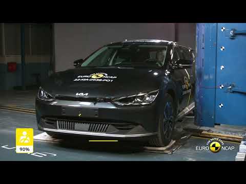 The passenger compartment of the EV6 remained stable in the frontal offset test. Dummy readings showed good protection of the knees and femurs of the driver and passenger. Kia showed that a similar level of protection would be provided to occupants of different sizes and to those sitting in different positions. Protection of the driver’s chest was rated as marginal, based on dummy readings of chest deflection and the lower leg was also rated as marginal. Analysis of the deceleration of the impact trolley during the test, and analysis of the deformable barrier after the test, revealed that the EV6 would be a benign impact partner in a frontal collision. With the exception of the chest of the rear passenger, protection of which was adequate, all critical body areas of both the driver and rear seat passenger were well protected. In both the side barrier test and the more severe pole impact, protection of all critical body areas was good and the car scored maximum points. Control of excursion (the extent to which a body is thrown to the other side of the vehicle when it is hit from the far side) was found to be marginal. The EV6 has a counter-measure to mitigate against occupant to occupant injuries in such impacts and this performed well in Euro NCAP's test. Tests on the front seats and head restraints demonstrated good protection against whiplash injuries in the event of a rear-end collision. A geometric analysis of the rear seats indicated marginal whiplash protection. The EV6 has an advanced eCall system which alerts the emergency services in the event of a crash. The car also has a system which applies the brakes after an impact, to avoid secondary collisions.