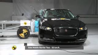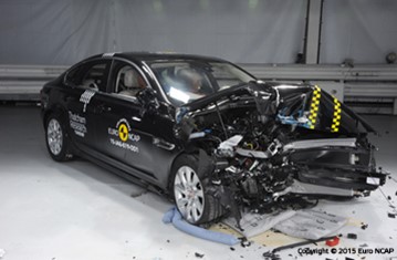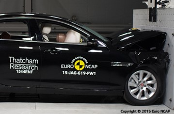 The passenger compartment of the XF remained stable in the frontal offset test. Dummy readings indicated good protection of the knees and femurs of both the driver and passenger dummies. Jaguar showed that a similar level of protection would be provided to occupants of different sizes and to those sat in different seating positions. In the full-width rigid barrier impact, protection of the driver and rear passenger was good for all critical body regions except the chest, protection of which was adequate. In the side barrier impact, dummy results indicated good protection of all critical body areas. However, both doors on the struck side of the vehicle became unlatched during the test and, although neither door opened, the car was penalised. No doors opened in the more severe side pole test and protection was good for all critical parts of the body. In Euro NCAP's tests, the front seats and head restraints demonstrated good protection against whiplash injury in the event of a rear-end collision. A geometric assessment of the rear seats indicated marginal whiplash protection for the occupants of those seats. The XF has a standard-fit autonomous emergency braking system which provides additional protection against whiplash at low, city speeds. The system performed well in Euro NCAP's tests.