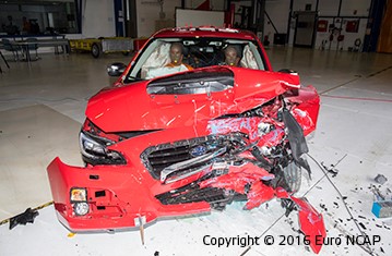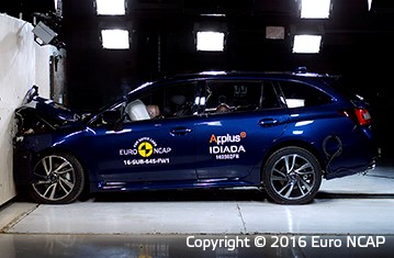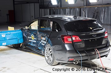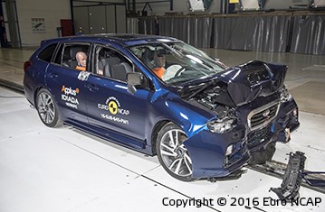 The passenger compartment remained stable in the frontal offset test. Dummy readings showed good protection of the knees and femurs of the driver and passenger. Subaru showed that a similar level of protection would be provided for occupants of different sizes and to those sat in different positions. Protection of the driver's chest was rated as marginal, owing to dummy readings of chest compression. In the full width rigid barrier test, protection was good except for the chest of the front seat driver, protection of which was adequate and the chest of the rear seat passenger, protection of which was marginal. In the side impact barrier test the Levorg scored maximum points with good protection of all critical body regions. In the more severe side pole impact, the Levorg provided good protection to all body regions except the chest, protection of which was adequate. Tests showed that the whiplash protection provided by the front seats and head restraints was good in the event of a rear end collision and a geometric assessment of the rear seats indicated good protection there also. Increased whiplash protection is provided by an autonomous emergency braking system. The system performed well in tests at the low speeds typical of city driving at which many whiplash accidents occur.
