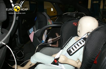 Based on dummy readings in the frontal and side impact tests, the DS5 lost a fraction of a point for the 3 year old child. The passenger airbag can be disabled to allow a rearward-facing child restraint to be used in that seating position, sufficient information was provided to the driver regarding the status of the airbag so the system was rewarded. Permanently attached labels on the sun visor clearly warn of the dangers of using a rearward facing child seat in that position without first disabling the airbag.