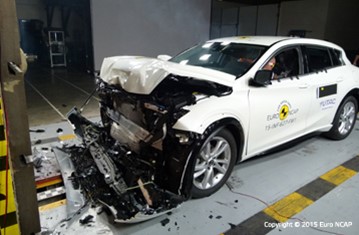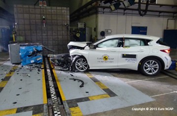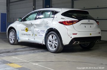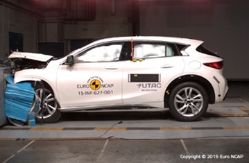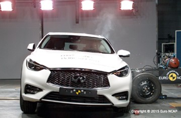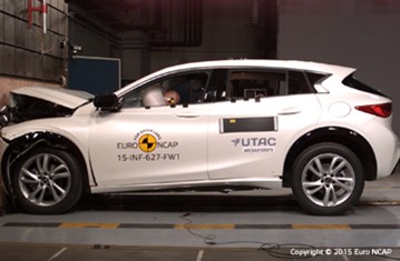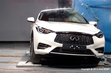 The passenger compartment remained stable in the frontal offset impact. Dummy readings indicated good protection of the knees and femurs of the driver and passenger. Infiniti showed that a similar level of protection would be provided to occupants of different sizes and to those sat in different positions. The Q30 scored maximum points for its protection of the front passenger dummy, with good protection of all critical body areas. In the full width rigid barrier test, protection of the driver was good for all body regions. For the rear passenger, protection of the head and femurs was good and that of the neck and chest was adequate. Full points were scored in the side impact barrier test, with good protection of all critical parts of the body. However, in the more severe side pole test, dummy readings of rib compression indicated marginal protection of the chest. Tests on the front seats and head restraints demonstrated a marginal level of whiplash protection in the event of a rear-end collision. A geometric assessment of the rear seats indicated poor whiplash protection for the occupants of those seats. The Q30 has a standard-fit autonomous emergency braking system which performed well in Euro NCAP's tests of its low-speed functionality. However, the system performance was not rewarded as front-seat whiplash protection was not rated as good.
