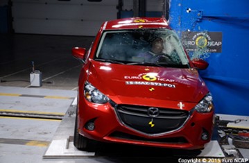 The passenger compartment of the Mazda 2 remained stable in the frontal offset barrier test. In that test, maximum points were scored for the protection of the passenger dummy and only a fraction of a point was lost for the driver. Dummy readings indicated good protection of the knees and femurs of both front seat occupants and Mazda showed that a similar level of protection would be provided to occupants of different sizes and to those sat in different seating positions. In the full-width frontal test, good protection was provided to all body regions of the front seat passenger except the neck, protection of which was rated as marginal owing to the neck extension measured during the test. Protection of the rear seat passenger was rated as good or adequate for all body regions. Maximum points were scored in the side impact barrier test, with good protection of all critical body regions. Even in the more severe side pole impact, protection was good and maximum points were scored. For the front seats and head restraints, tests indicated good protection against whiplash injuries in the event of a rear-end collision but a geometric assessment of the rear seats indicated poor protection. A low-speed autonomous emergency braking system is available as an option for the Mazda 2. However, as it is not standard equipment, the system did not qualify for inclusion in the assessment.