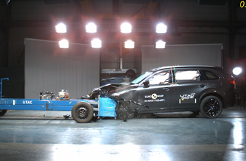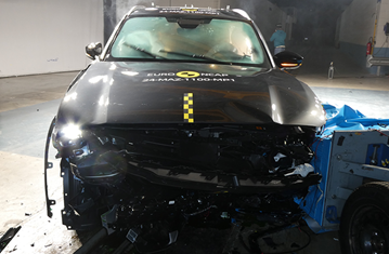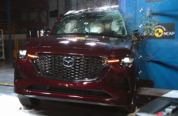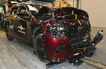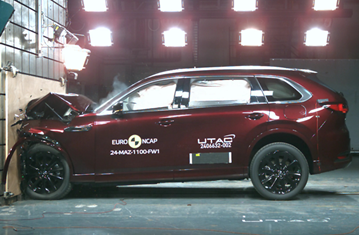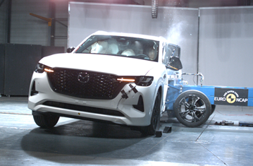 The passenger compartment of the Mazda CX-80 remained stable in the frontal offset test. Dummy readings indicated good protection of the knees and femurs of the driver and front passenger. Mazda demonstrated that a similar level of protection would be provided to occupants of different sizes and to those sitting in different positions. Protection was good for all critical parts of the body of the front passenger dummy. Analysis of the deceleration of the impact trolley during the test, and analysis of the deformable barrier after the test, revealed that the Mazda CX-80 would be a benign impact partner in a frontal collision. In the full-width rigid barrier test, protection of the rear passenger’s chest was rated as adequate but, otherwise, all critical parts of the body were well protected for both occupants. In both the side barrier test and the more severe side pole impact, protection was good for all critical body areas and the CX-80 scored full points in this part of the assessment. Control of excursion (the extent to which a body is thrown to the other side of the vehicle when it is hit from the far side) was found to be adequate. The Mazda CX-80 has a countermeasure to mitigate against occupant-to-occupant injuries in such impacts. The airbag performed well in Euro NCAP’s tests with dummy readings indicating good protection for both the driver and passenger. Tests on the front seats and head restraints demonstrated good protection against whiplash injuries in the event of a rear-end collision. A geometric analysis of the rear seats also indicated good whiplash protection. The car has an advanced eCall system which alerts the emergency services in the event of a crash, and a system to prevent secondary impacts after the car has been in a collision. Mazda demonstrated that the doors and windows would be openable to allow occupants to escape in the event of vehicle submergence.