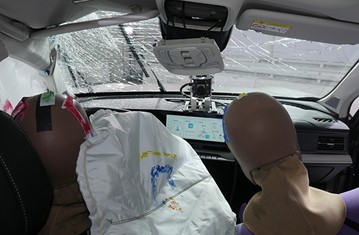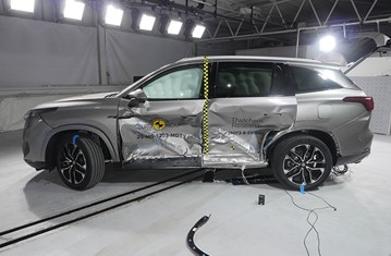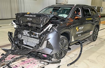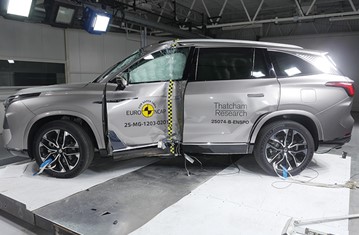 The passenger compartment of the MG MGS9 PHEV remained stable in the frontal offset test. Dummy readings indicated good protection of the knees and femurs of both the driver and front passenger. However, some structure in the dashboard on the driver’s side were thought to pose a risk of injury to occupants of different sizes and those sitting in different positions, and the score was penalised. Analysis of the deceleration of the impact trolley during the test, and analysis of the deformable barrier after the test, revealed that the MG MGS9 PHEV would be a moderately benign impact partner in a frontal collision. In the full-width rigid barrier test, protection of the chest of the rear passenger was rated as weak, based on dummy readings of compression. Protection was otherwise good or adequate. In the side barrier test, the MG MGS9 PHEV provided good protection to all critical body areas and scored maximum points. In the more severe side pole impact, protection was at least adequate for all critical body areas. Control of excursion (the extent to which a body is thrown to the other side of the vehicle when it is hit from the far side) was found to be adequate The MG MGS9 PHEV has a countermeasure to mitigate against occupant-to-occupant injuries in such impacts. The airbag performed well in Euro NCAP’s tests with dummy readings indicating good protection for both the driver and passenger. Tests on the front seats and head restraints demonstrated good protection against whiplash injuries in the event of a rear-end collision. However, a geometric analysis of the rear seats indicated marginal whiplash protection. The car has an advanced eCall system which alerts the emergency services in the event of a crash, and a system to prevent secondary impacts after the car has been in a collision. MG demonstrated that the doors and windows would be openable to allow occupants to escape in the event of vehicle submergence.