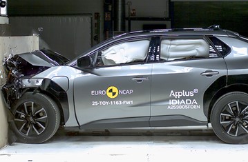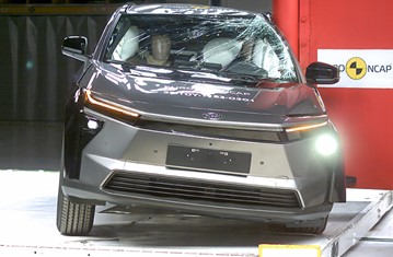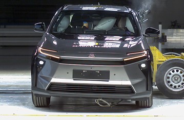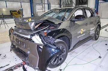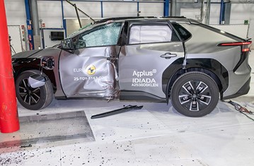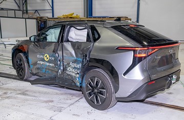 The passenger compartment of the Toyota bz4X remained stable in the frontal offset test. Dummy readings indicated good protection of the knees and femurs of both the driver and the front seat passenger. Toyota showed that a similar level of protection would be provided to occupants of different sizes and to those sitting in different positions. Protection was good for all critical body areas of the front passenger. Analysis of the deceleration of the impact trolley during the test, and analysis of the deformable barrier after the test, revealed that the Toyota bz4X would be a moderately benign impact partner in a frontal collision. In the full-width rigid barrier test, protection of the driver’s chest was rated as marginal, based on dummy readings of compression, but protection was otherwise good or adequate. In the side barrier test, the Toyota bz4X provided good protection to all critical body areas and scored maximum points. In the more severe side pole impact, chest protection was marginal but that of other critical body areas was good. Control of excursion (the extent to which a body is thrown to the other side of the vehicle when it is hit from the far side) was found to be adequate The Toyota bz4X has a countermeasure to mitigate against occupant-to-occupant injuries in such impacts. The airbag performed well in Euro NCAP’s tests with dummy readings indicating good protection for both the driver and passenger. Tests on the front seats and head restraints demonstrated good protection against whiplash injuries in the event of a rear-end collision. A geometric analysis of the rear seats also indicated good whiplash protection. The car has an advanced eCall system which alerts the emergency services in the event of a crash, and a system to prevent secondary impacts after the car has been in a collision. Toyota demonstrated that the doors and windows would be openable to allow occupants to escape in the event of vehicle submergence.
