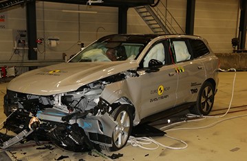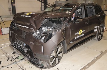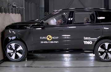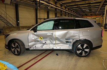 The passenger compartment of the Volvo EX90 remained stable in the frontal offset test. Protection of all critical body areas was good for the front passenger. Dummy readings indicated good protection of the knees and femurs of both the driver and the front seat passenger. Volvo showed that a similar level of protection would be provided to occupants of different sizes and to those sitting in different positions. Analysis of the deceleration of the impact trolley during the test, and analysis of the deformable barrier after the test, revealed that the Volvo EX90 would be a somewhat aggressive impact partner in a frontal collision. In the full-width rigid barrier test, protection was good for all critical body regions of the driver and at least adequate for the rear seat passenger. In both the side barrier test and the more severe side pole impact, good protection was provided to all critical body areas and the Volvo EX90 scored maximum points in this part of the assessment. Control of excursion (the extent to which a body is thrown to the other side of the vehicle when it is hit from the far side) was found to be adequate The Volvo EX90 has a countermeasure to mitigate against occupant-to-occupant injuries in such impacts. The airbag performed well in Euro NCAP’s tests with dummy readings indicating good protection for both the driver and passenger. Tests on the front seats and head restraints demonstrated good protection against whiplash injuries in the event of a rear-end collision. A geometric analysis of the rear seats also indicated good whiplash protection. The car has an advanced eCall system which alerts the emergency services in the event of a crash, and a system to prevent secondary impacts after the car has been in a collision. Volvo demonstrated that the doors and windows would be openable to allow occupants to escape in the event of vehicle submergence.