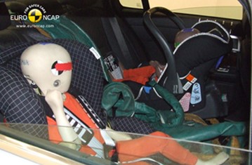 In the frontal impact, movement of the head of the 3 year dummy, sat in a forward facing restraint, was not excessive. In the side impact, both dummies were properly contained within the protective shells of their restraints. The front passenger airbag cannot be disabled to allow a rearward facing child restraint to be used in that seating position. The labels warning of the dangers of using a rearward facing restraint in that seating position were not sufficiently clear. Jaguar have investigated the reasons why the child restraints did not have permanent labels when the car was tested in 2010 and have ensured that dealers can now supply units with permanently attached instructions and information.