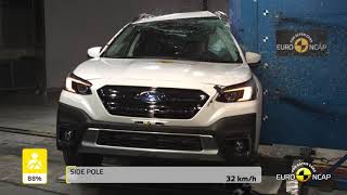 The passenger compartment of the Outback remained stable in the frontal offset test. Dummy numbers showed good protection of the knees and femurs of both the driver and passenger. Subaru showed that a similar level of protection would be provided to occupants of different sizes and to those sitting in different positions. Dummy readings of the driver's chest compression indicated marginal protection for this body area. Analysis of the deceleration of the impact trolley during the test, and analysis of the deformable barrier after the test, revealed that the Outback would be a moderately benign impact partner in a frontal collision. Apart from the rear passenger's chest, protection of which was marginal, all critical body regions of both occupants were well protected. In the side barrier test, protection of all critical body areas was good and the car scored maximum points in this part of the assessment. In the more severe side pole impact, protection of all critical body areas was good and the car scored maximum points. The Outback is not equipped with a far-side counter-measure such as a centre airbag. Tests showed excursion (the extent to which an occupant is thrown to the other side of the car in a side impact) was adequately controlled. Tests on the front seats and head restraints demonstrated good protection against whiplash injuries in the event of a rear-end collision. A geometric analysis of the rear seats also indicated good whiplash protection. The Outback has a post-collision braking system, designed to prevent secondary impacts, and an advanced eCall which automatically alerts the emergency services in the event of a serious accident.