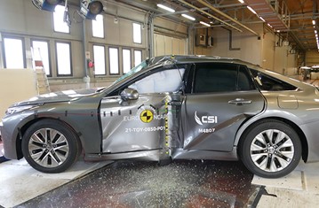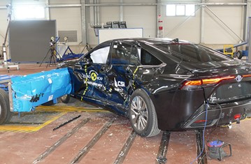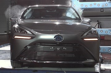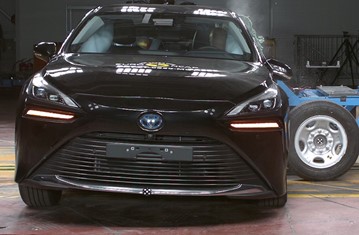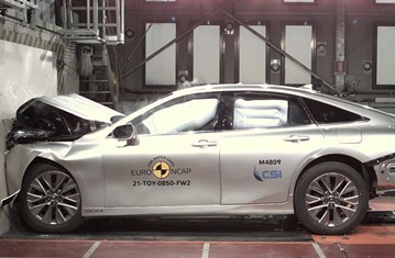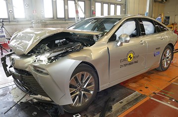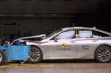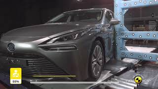 The passenger compartment of the Mirai remained stable in the frontal offset test. Dummy numbers showed good protection of the knees and femurs of both the driver and passenger. Toyota showed that a similar level of protection would be provided to occupants of different sizes and to those sitting in different positions. Protection of the driver's chest was rated as marginal, based on dummy readings of compression. Analysis of the deceleration of the impact trolley during the test, and analysis of the deformable barrier after the test, reveleaed that the Mirai would be a moderately benign impact partner in a frontal collision. In the full-width rigid barrier test, good or adequate protection was provided to all critical body areas, for both the driver and rear passenger. In both the side barrier test and the more severe side pole impact, protection of all critical body areas was good and the car scored maximum points in this part of the assessment. Limitation of excursion (the extent to which a body is thrown to the other side of the car in the event of an impact from the far side) was rated as adequate. The Mirai does not have a counter-measure, such as a centre airbag, to mitigate occupant to occupant injuries in such impacts. Tests on the front seats and head restraints demonstrated good protection against whiplash injuries in the event of a rear-end collision. A geometric analysis of the rear seats also indicated good whiplash protection. The Mirai automatically applies the brakes immediately after a collision, to prevent secondary impacts, and is equipped with an advanced eCall system which alerts the emergency services in the event of a serious accident.