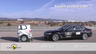 The passenger compartment of the 5 Series remained stable in the offset frontal impact. Dummy readings indicated good protection of the knees and femurs of the driver and passenger. BMW demonstrated that, for the passenger's side, a similar level of protection would be provided to occupants of different sizes and to those sat in different positions. On the driver's side, incorrect deployment of the knee airbag in the full-width test led to penalties for this body region in both frontal impact tests. In the full-width frontal test, the knee airbag did not deploy quickly enough to get between the right knee and the dashboard. Although dummy readings for both legs were good, protection of the knee/femur/pelvis region was penalised. BMW stated that the airbag deployment seen in Euro NCAP's test was anomalous and had not been observed in their development tests. Protection of the neck of the driver and the chest of the rear passenger was rated as marginal. In the side barrier test, maximum points were scored, with good protection of all critical body regions. Even in the more severe side pole test, protection was good, apart from the chest, protection of which was adequate. Tests on the front seats and head restraints demonstrated good protection against whiplash injuries in the event of a rear-end collision. A geometric assessment of the rear seats indicated good protection there too. The 5 Series has, as standard, and autonomous emergency braking system which operates at the low speeds, typical of city driving, at which many whiplash injuries are caused. The system scored maximum points in Euro NCAP's tests, with complete avoidance of collision at all test speeds.