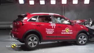 The passenger compartment remained stable in the frontal offset test. Dummy readings indicated good protection of the knees and femurs of the driver and passenger. Kia showed that a similar level of protection would be provided to occupants of different sizes and to those sat in different positions. In the full-width frontal impact, protection of the driver was good or adequate. However, protection of the rear seat occupant was rated as weak for the chest and poor for the pelvis. Dummy readings indicated that the pelvis had slipped under the seatbelt instead of being properly restrained by it. In the side barrier and more severe side pole impact, the Niro scored maximum points, with good protection of all critical body areas. Tests showed good protection from the front seats and head restraints against whiplash injuries in the event of a rear-end collision. A geometric assessment of the rear seats indicated marginal protection. Additional whiplash protection is available from the 'Advanced Driving Assistance Pack', available as an option and not included in this assessment.
