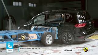 The passenger compartment of the VW Touran remained stable in the frontal offset test. Dummy readings indicated a possibility of injury to the driver’s femur and protection of this body area was rated as marginal. Dummy readings of compression also indicated marginal protection of the chest of the driver. Analysis of the deceleration of the impact trolley during the test, and analysis of the deformable barrier after the test, revealed that the car would be an aggressive impact partner in a frontal collision. In the full-width rigid barrier test, protection of all critical body regions was good or adequate for both the driver and rear passenger. In both the side barrier impact and the more severe side pole test, protection of all critical body areas was good and the Touran scored maximum points in this part of the assessment. Control of excursion (the extent to which a body is thrown to the other side of the vehicle when it is hit from the far side) was found to be poor. The Touran does not have a counter-measure to mitigate against occupant to occupant injuries in such impacts. Tests on the front seats and head restraints demonstrated good protection against whiplash injuries in the event of a rear-end collision. A geometric analysis of the rear seats also indicated good whiplash protection. The Touran has an advanced eCall system which alerts the emergency services in the event of a crash. The car's ‘Multi Collision Braking’ system automatically applies the brakes to prevent secondary collisions but did not bring the car to a halt and was not rewarded.
