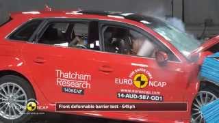 In the dynamic crash tests the A3 Sportback e-tron scored maximum points for its protection of the 1½ year and 3 year dummies, both of which were sat in rearward-facing group 0+/1 child restraints. In the side impact, both dummies were properly contained within the protective shells of their restraints, minimising the risk of head contact with the vehicle interior. The front passenger airbag can be disabled to allow a rearward-facing child restraint to be used in that seating position. However, the switch to disable the airbag is not standard so it was not eligible to score points in the assessment. Some types of child restraints could not be accommodated in the car. The front passenger airbag disabling switch is not standard and, without it, the group 0+ universal restraint cannot be safely used in that seating position. The group II/III semi-universal restraint could not be properly positioned in the rear outboard seats. Other restraint types could be properly installed and accommodated.