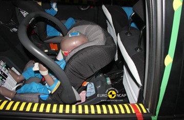 In the frontal test, forward head movement of the 3 year infant, sat in a forward-facing seat, was not excessive and both dummies' heads were contained by the restraints in the side impact. The passenger airbag can be disabled to allow a rearward-facing restraint to be used in that seating position. However, insufficient information is presented to the driver regarding the status of the airbag.