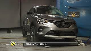 The passenger compartment of the Captur remained stable in the frontal offset test. Dummy readings indicated good protection of the knees and femurs of the driver and passenger. Renault showed that a similar level of protection would be provided to occupants of different sizes and to those sitting in different positions. Protection was rated as good for all critical body areas for the passenger. In the full-width rigid barrier test, protection was good or adequate for all critical body areas, both for the driver and the rear passenger. In the side barrier impact, protection of all critical body areas was good and the car scored full points in this test. Even in the more severe side pole test, protection of the chest was adequate and that of other body regions was good. Tests on the front seats and head restraints demonstrated good protection against whiplash injuries in the event of a rear-end collision. A geometric assessment of the rear seats also indicated good whiplash protection. The standard-fit autonomous emergency braking (AEB) system performed well in tests of its functionality at the low speeds at which many whiplash injuries occur, with collisions avoided in most test scenarios.