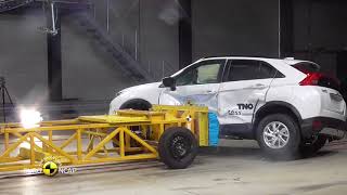 The passenger compartment of the Eclipse Cross remained stable in the frontal offset test. Dummy readings showed good protection of the knees and femurs of both the driver and passenger. Mitsubishi demonstrated that a similar level of protection would be provided to occupants of different sizes and to those sat in different positions. in the full-width rigid barrier test, protection of the chest of the rear passenger was rated as marginal, based on dummy measurements of compression but, otherwise, protection of both dummies was good or adequate. In both the side barrier test and the more severe side pole impact, protection of all critical body areas was good and the Eclipse Cross scored maximum points. Tests on the front seats and head restraints demonstrated good protection against whiplash injury in the event of a rear-end collision. A geometric assessment of the rear seats also indicated good whiplash protection. The standard-fit 'Forward Collision Mitigation' (FCM) system performed well in tests of its functionality at the low speeds typical of city driving, with collisions avoided at all test speeds.