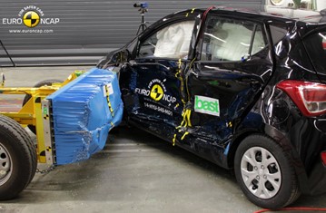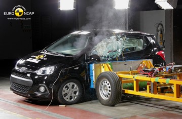 Based on dummy readings in the dynamic tests, the i10 scored maximum points for its protection of the 1½ year infant. In the frontal impact, forward movement of the 3 year dummy, sat in a forward-facing restraint, was not excessive but chest loads indicated only fair protection of this body region and neck forces were also high. In the side impact, both dummies were properly contained within the protective shells of their restraints, minimising the risk of head contact with parts of the car interior. The passenger airbag can be disabled to allow a rearward-facing child restraint to be used in that seating position. The information provided to the driver regarding the status of the airbag is clear and the system was rewarded. All of the child restraints for which the car is designed could be properly accommodated and fitted in the i10.