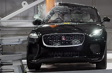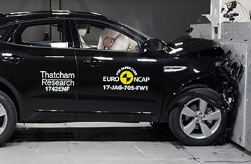 The passenger compartment of the E-Pace remained stable in the frontal offset test. There was insufficient pressure in the driver's airbag to prevent a slight head contact to the steering wheel. Although the contact was not sufficient to influence the measured injuries, the car was penalised and the driver's head protection downgraded to adequate. Dummy readings indicated good protection of the knees and femurs of both the driver and passenger. Jaguar showed that the same level of protection would be provided to occupants of different sizes and to those sat in different positions. Protection of the driver's lower leg was rated as weak, based on dummy readings in the tibia. In the full-width rigid barrier test, protection of both the driver and the rear passenger was adequate or good for all critical body areas. The E-Pace scored maximum points in the side barrier impact, with good protection of all critical parts of the body. In the more severe side pole impact, protection of the chest was adequate and that of other body areas was good. Tests on the front seats and head restraints demonstrated good protection against whiplash injury in the event of a rear-end collision. However, a geometric assessment of the rear seats indicated poor whiplash protection. The standard autonomous emergency braking system performed well in tests of its functionality at the low speeds at which many whiplash injuries are caused, with collisions avoided or mitigated at all test speeds.