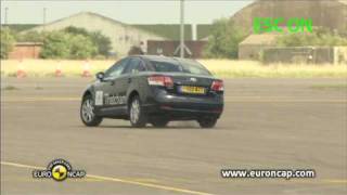 The passenger compartment remained stable in the frontal test. Dummy readings showed good protection of the knees and femurs of both driver and passenger. Toyota showed that a similar level of protection would be provided to occupants of different sizes or those sat in different positions. The Avensis scored maximum points for all body regions in the side barrier test. In the side pole impact, the dummy was loaded in a way which is unrepresentative of a human and the car was penalised. Combined with the rib deflections measured in the test, protection of the chest in this test was rated as weak. However, protection against whiplash injuries was good.