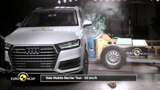 The passenger compartment of the Q7 remained stable in the frontal impact. Dummy readings showed good protection of the knees and femurs of the driver and passenger. Audi demonstrated that a similar level of protection would be provided to occupants of different sizes and to those sat in different positions. Measurements of chest compression in the driver dummy indicated a marginal level of protection for this part of the body. In the full width rigid barrier test, all critical body areas except the chest were well protected. Chest protection for the rear passenger dummy was adequate and that of the driver dummy was again marginal. In both the side barrier impact and the more severe side pole test, protection of all critical body regions was good and maximum points were scored. The front seats and head restraints provided good protection against whiplash injuries in the event of a rear-end collision, and a geometric assessment of the rear seats indicated good whiplash protection here too. An autonomous emergency braking system is fitted as standard on the Q7 and operates from the low speeds, typical of city driving, at which many whiplash injuries are caused. Its performance in Euro NCAP's tests was good.