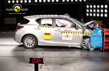 The passenger compartment of the CT200h remained stable in the frontal impact. Knee airbags for the driver and passenger provided good protection to the knees and femurs. Lexus were able to show that a similar level of protection would be provided to occupants of different sizes and to those sat in different seating positions. Maximum points were scored in the side barrier impact, with all body regions being well protected. In the more severe side pole impact, chest protection was rated as marginal, based on dummy readings of rib deflections. Protection against whiplash injuries in the event of a rear-end collision was rated as good.