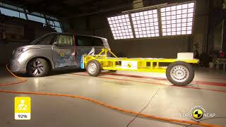 The passenger compartment of the VW ID. Buzz remained stable in the frontal offset test. Dummy readings indicated good protection of the knees and femurs of both the driver and passenger. VW demonstrated that a similar level of protection would be provided to occupants of different sizes and to those sitting in different position. Protection was good for all critical body areas of the passenger dummy. Analysis of the deceleration of the impact trolley during the test, and analysis of the deformable barrier after the test, revealed that the car would be a moderately benign partner in a frontal collision. In the full-width rigid barrier test, chest protection was rated as marginal for the rear passenger, based on dummy readings of compression but, protection of all critical body areas was good for both the driver and rear passenger. In both the side barrier test and the more severe side pole impact, dummy readings indicated good protection of all critical body areas. However, in the pole test, the curtain airbag got trapped on the interior trim and did not fully deploy as intended, so a penalty was applied to the head score in both side impacts. Control of excursion (the extent to which a body is thrown to the other side of the vehicle when it is hit from the far side) was adequate. The ID. Buzz has a counter-measure to mitigate against occupant to occupant injuries in such impacts. The system performed well in Euro NCAP’s tests, with good protection of the occupants’ heads. Tests on the front seats and head restraints demonstrated good protection against whiplash injuries in the event of a rear-end collision. A geometric analysis of the rear seats also indicated good whiplash protection. The ID. Buzz has an advanced eCall system which alerts the emergency services in the event of a crash and a ‘multi-collision braking’ system applies the brakes to prevent secondary collisions.