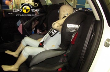 In the frontal impact, forward movement of the head of the 3 year dummy was not excessive. The 18 month dummy was sat in a rearward facing restraint which also provided good protection to the head. In the side impact test, both dummies were properly contained by the protective shells of their restraints. The passenger's airbag can be disabled by means of a switch in the glove box, allowing a rearward facing child restraint to be used in that seating position. Clear information is presented to the driver regarding the status of the airbag and the system was rewarded.