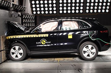 The passenger compartment of the Cayenne remained stable in the frontal offset test. Dummy readings indicated good protection of the knees and femurs of the driver and passenger. Porsche showed that a similar level of protection would be provided to occupants of different sizes and to those sat in different positions. In the full-width rigid barrier test, protection was good or adequate for all critical body regions of both dummies except the chest of the rear passenger, protection of which was rated as marginal based on readings of chest compression. In the side barrier test, protection of all critical body areas was good and the Cayenne scored maximum points. Even in the more severe side pole test, protection of the chest was adequate and that of other critical body areas was good. Tests on the front seats and head restraints demonstrated good protection against whiplash injury in the event of a rear-end collision. A geometric assessment of the rear seats also indicated good whiplash protection. The Cayenne has a standard-fit autonomous emergency braking system. Tests of its performance at the low speeds, typical of city driving, at which many whiplash injuries are caused revealed good performance, with impacts avoided at all test speeds.
